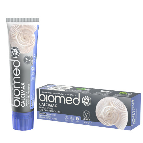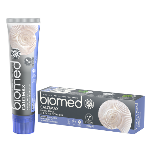 Biomed CALCIMAX zubna pasta za jačanje s soli iz antičkih mora i kalcijev hidroksiapatit za učinkovitu zaštitu od karijesa i remineralizacije cakline. Jaki zubi grade karakter!